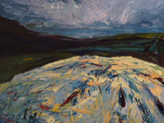 In this painting, the artist takes our eyes on a journey across the hills of Salrock in Connemara, where huge monoliths are revealed like the very the bones of the landscape. Painted in heavy impasto, the beautiful colours of the lichens and minerals in the rocks’ seams are revealed. The vigorous palette knife rendering of lines and grooves in the stone illustrate the artist’s appreciation of the secret geological dynamism of this land.